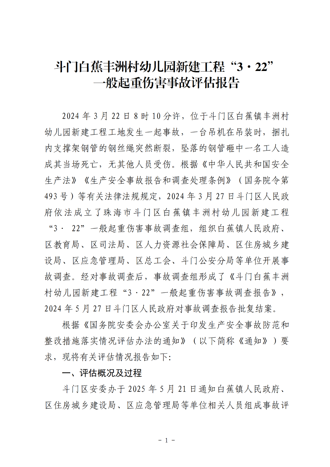 斗門白蕉豐洲村幼兒園新建工程“3·22”一般起重傷害事故評(píng)估報(bào)告