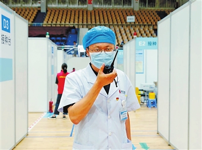 “呼叫2號崗醫(yī)生,請回答請回答……”,手持無線對講機,腳步來去匆忙,快步穿梭于接種區(qū)、留觀區(qū)、登記區(qū)之間。