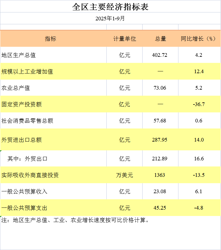 前三季度,全區(qū)經(jīng)濟(jì)延續(xù)回升向好態(tài)勢,實(shí)現(xiàn)地區(qū)生產(chǎn)總值402.72億元,同比增長4.2%。
