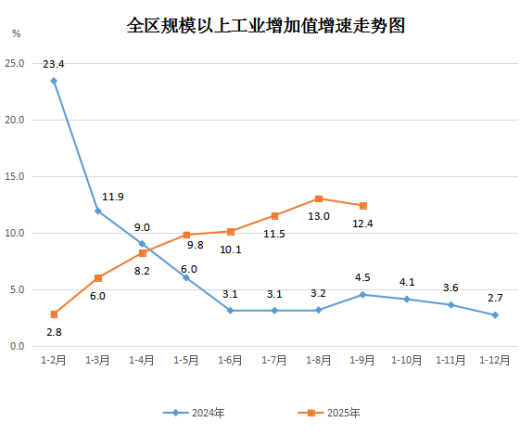(二)工業(yè)生產(chǎn)持續(xù)較快增長。前三季度,全區(qū)規(guī)模以上工業(yè)增加值同比增長12.4%,增速高于上半年2.3個(gè)百分點(diǎn)。現(xiàn)代產(chǎn)業(yè)中,先進(jìn)制造業(yè)增加值同比增長20.2%。
