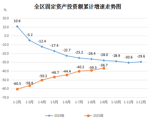 (三)固定資產(chǎn)投資降幅進(jìn)一步收窄。前三季度,全區(qū)固定資產(chǎn)投資同比下降36.7%,降幅較1-8月、上半年分別收窄2.6、7.7個(gè)百分點(diǎn)。其中工業(yè)技術(shù)改造投資下降1.1%。