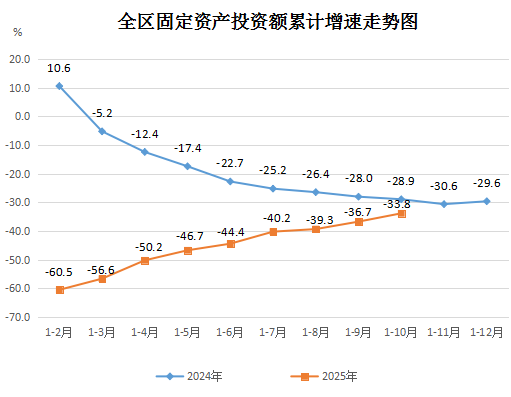 (三)固定資產(chǎn)投資降幅穩(wěn)步收窄。1-10月,全區(qū)固定資產(chǎn)投資同比下降33.8%,降幅較1-9月收窄2.9個(gè)百分點(diǎn)。其中工業(yè)技術(shù)改造投資增長(zhǎng)9.4%。